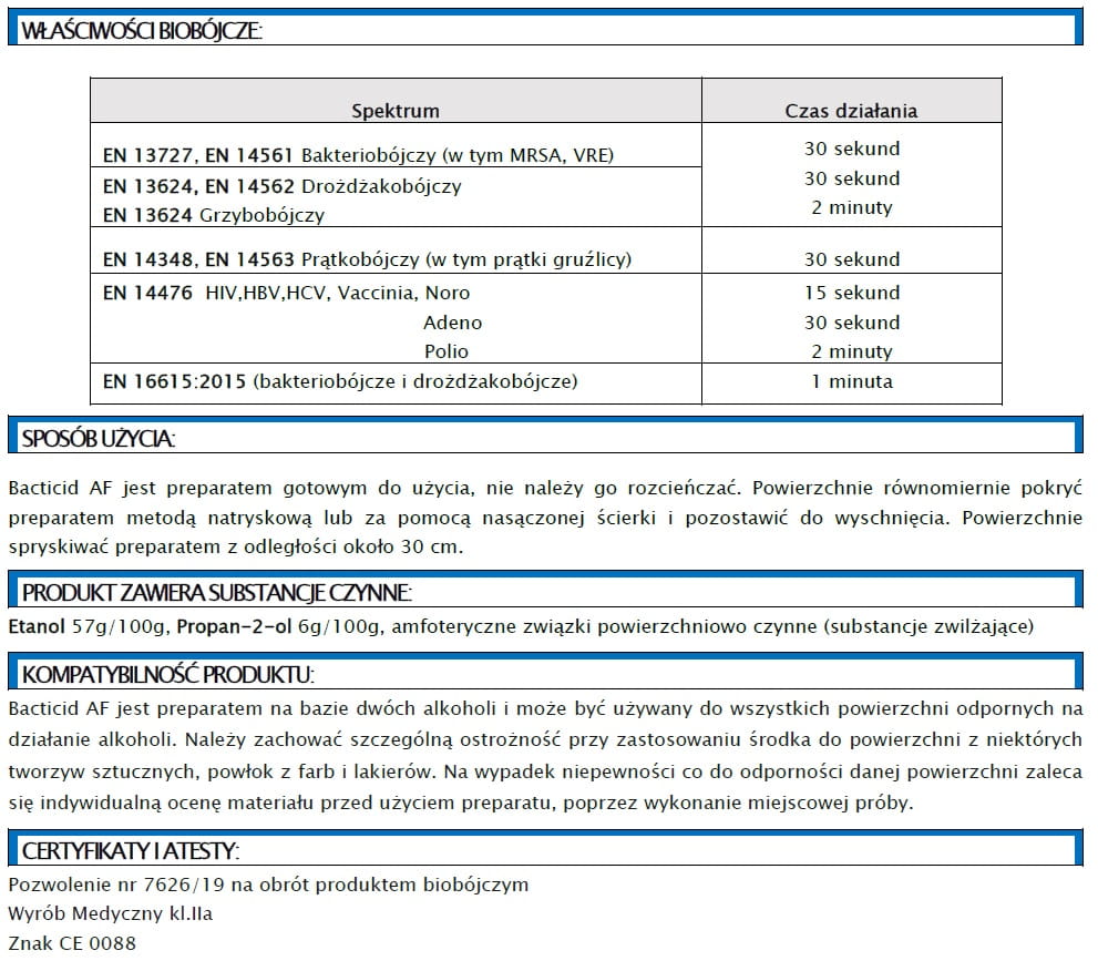 - Bacticid AF jest preparatem na bazie dwóch alkoholi i może być używany do wszystkich powierzchni odpornych na działanie alkoholi.