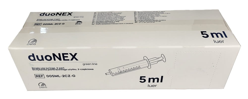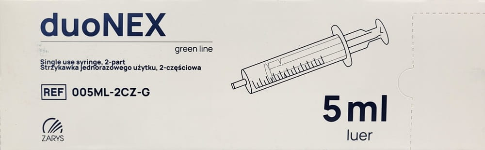 Opakowanie handlowe: 100 strzykawek pakowanych pojedynczo, sterylnych, 2-częściowych o pojemności 5 ml z zielonym tłokiem DuoNex