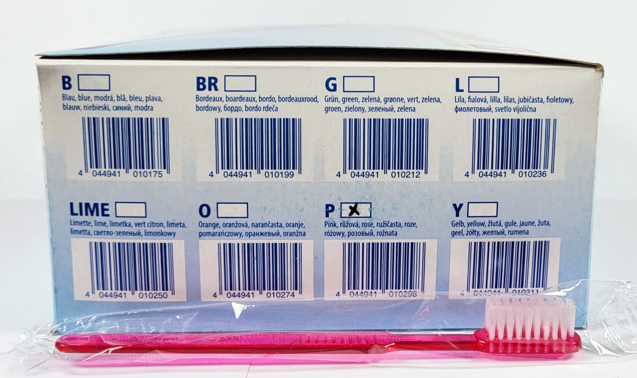 Opakowanie handlowe - kartonik 100 szczoteczek z pastą do zębów zapakowanych osobno, kod kreskowy 4044941010298