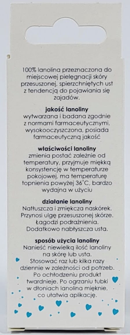 UWAGA: w niższej temperaturze lanolina "twardnieje" i może wymagać "ogrzania" w dłoniach przed aplikacją. Z kolei w temperaturze powyżej 36 stopni przybiera postać płynną. Zmiany stanu skupienia nie wpływają na właściwości preparatu.