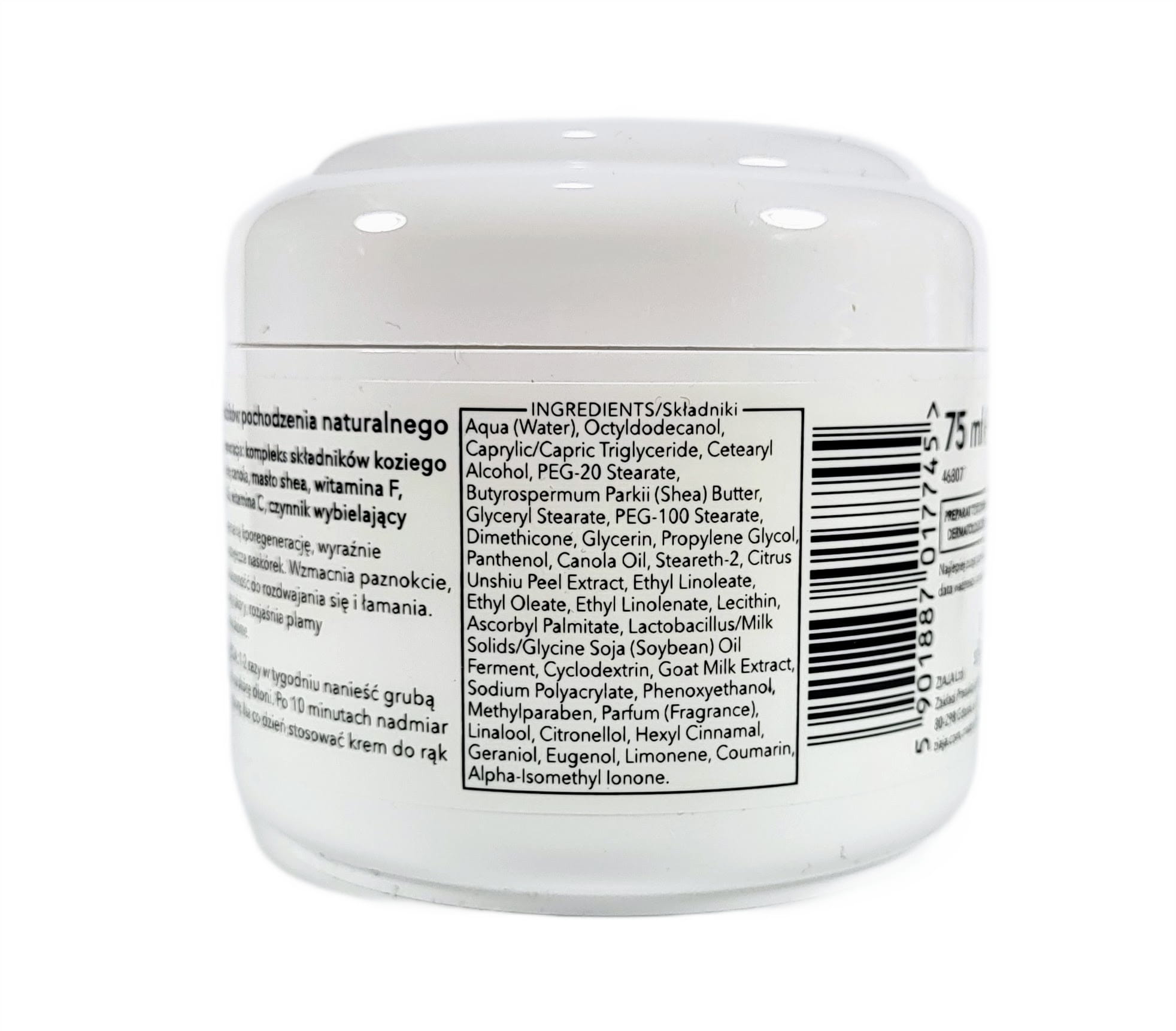 Aqua (Water), Octyldodecanol, Caprylic/Capric Triglyceride, Cetearyl Alcohol, PEG-20 Stearate, Butyrospermum Parkii (Shea) Butter, Glyceryl Stearate, PEG-100 Stearate, Dimethicone, Glycerin, Propylene Glycol, Panthenol, Canola Oil, Steareth-2, Citrus Unshiu Peel Extract, Ethyl Linoleate, Ethyl Oleate, Ethyl Linolenate, Lecithin, Ascorbyl Palmitate, Lactobacillus/Milk Solids/Glycine Soja (Soybean) Oil Ferment, Cyclodextrin, Goat Milk Extract, Sodium Polyacrylate, Phenoxyethanol, Methylparaben, Parfum (Fragrance), Hexyl Cinnamal, Linalool, Citronellol, Geraniol, Eugenol, Limonene, Amyl Cinnamal, Coumarin, Alpha-Isomethyl Ionone.